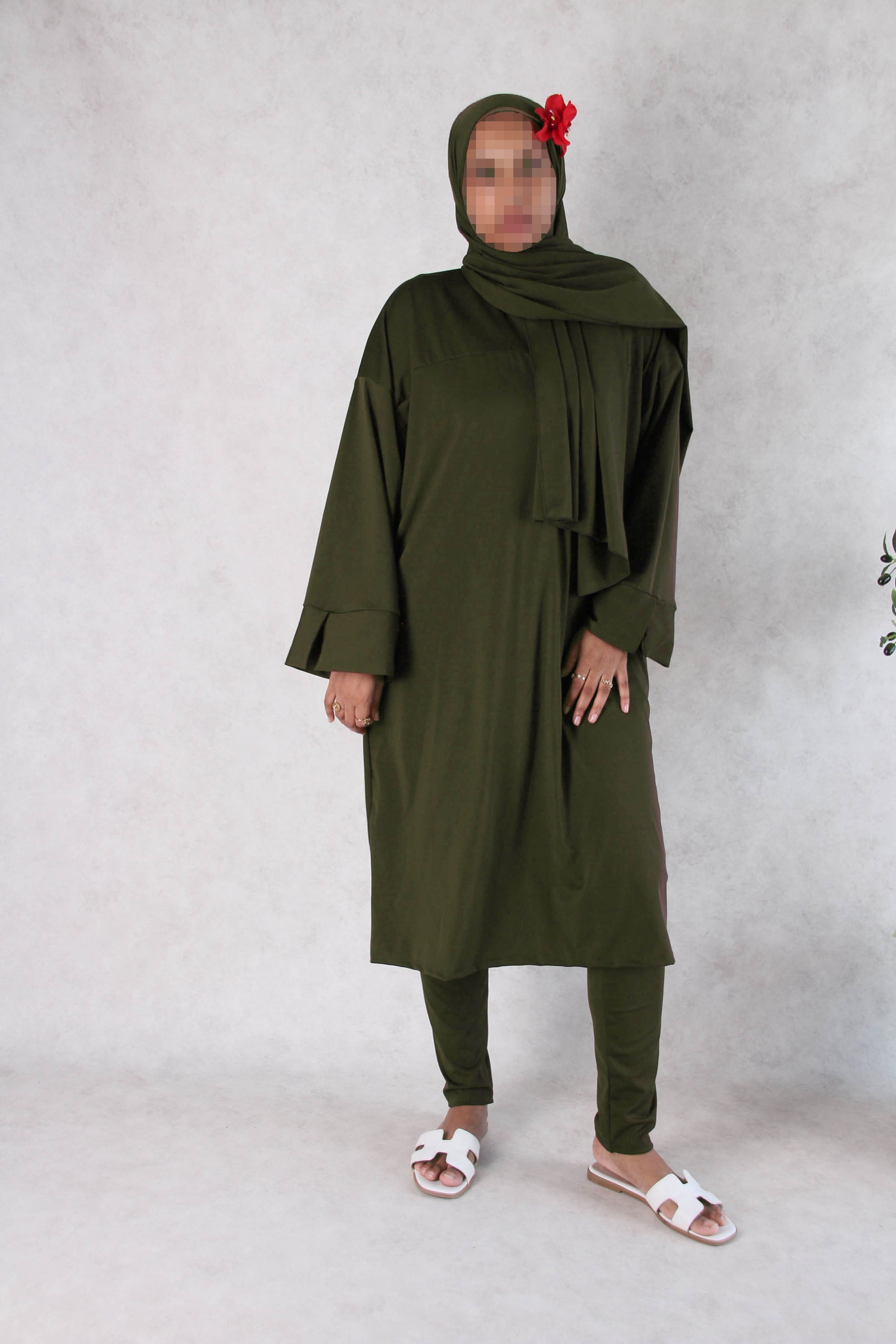 3 pièces incluses : tunique longue, pantalon ajusté et hijab assorti la tunique peut s'attacher au pantalon grâce à deux languettes