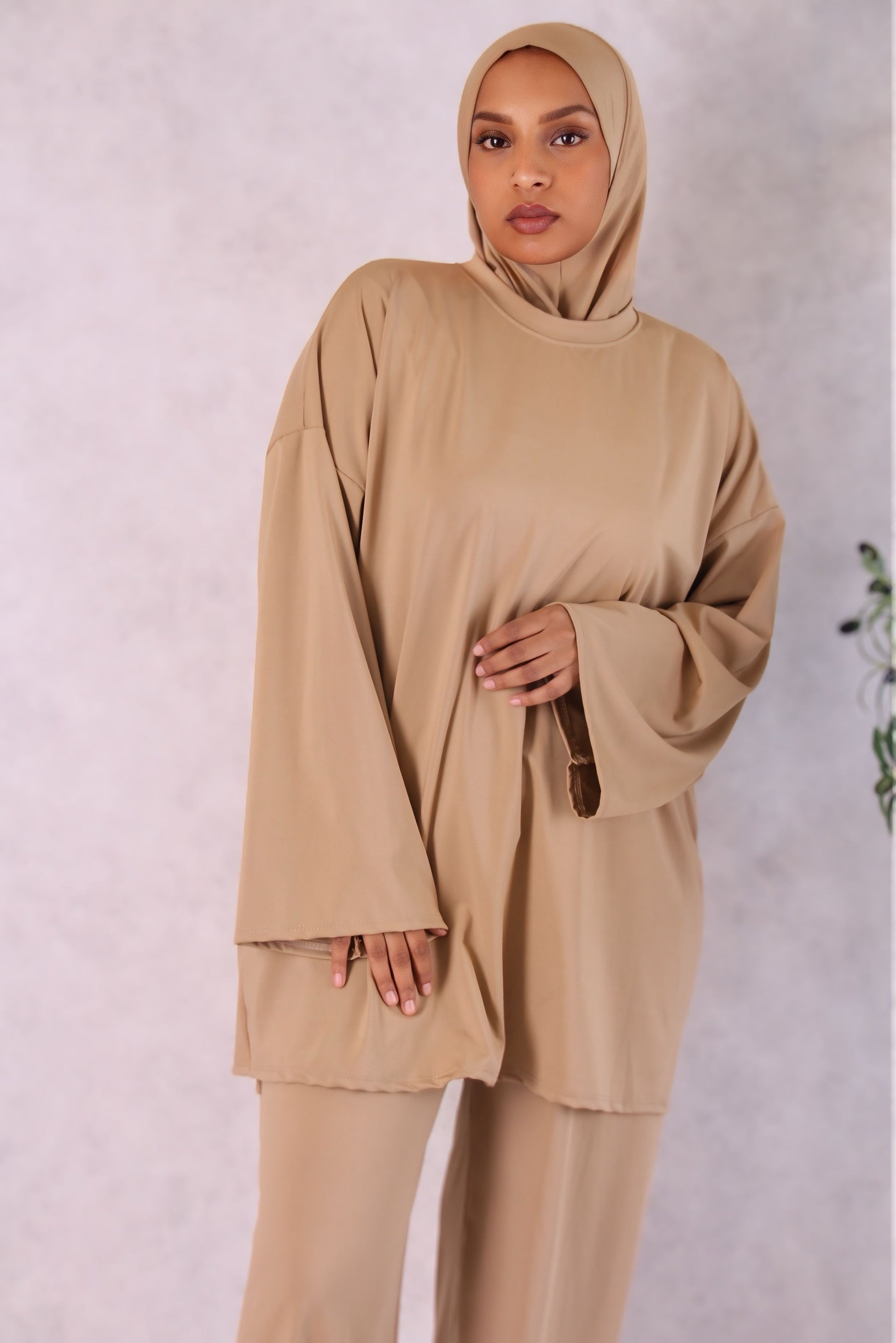 Tunique : Longueur 75 cm, manches longues et amples pour une couvrance maximale.