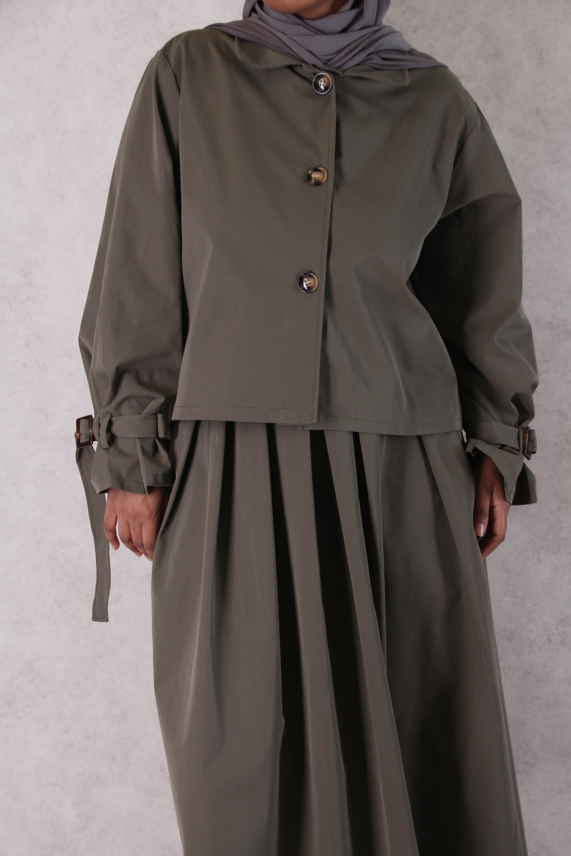Un ensemble matière style imperméable et structuré qui allie confort et élégance. La veste oversize boutonnée apporte une touche moderne, tandis que la jupe longue plissée offre un tombé raffiné et modeste. Parfait pour une sortie habillée, ou au quotidien.