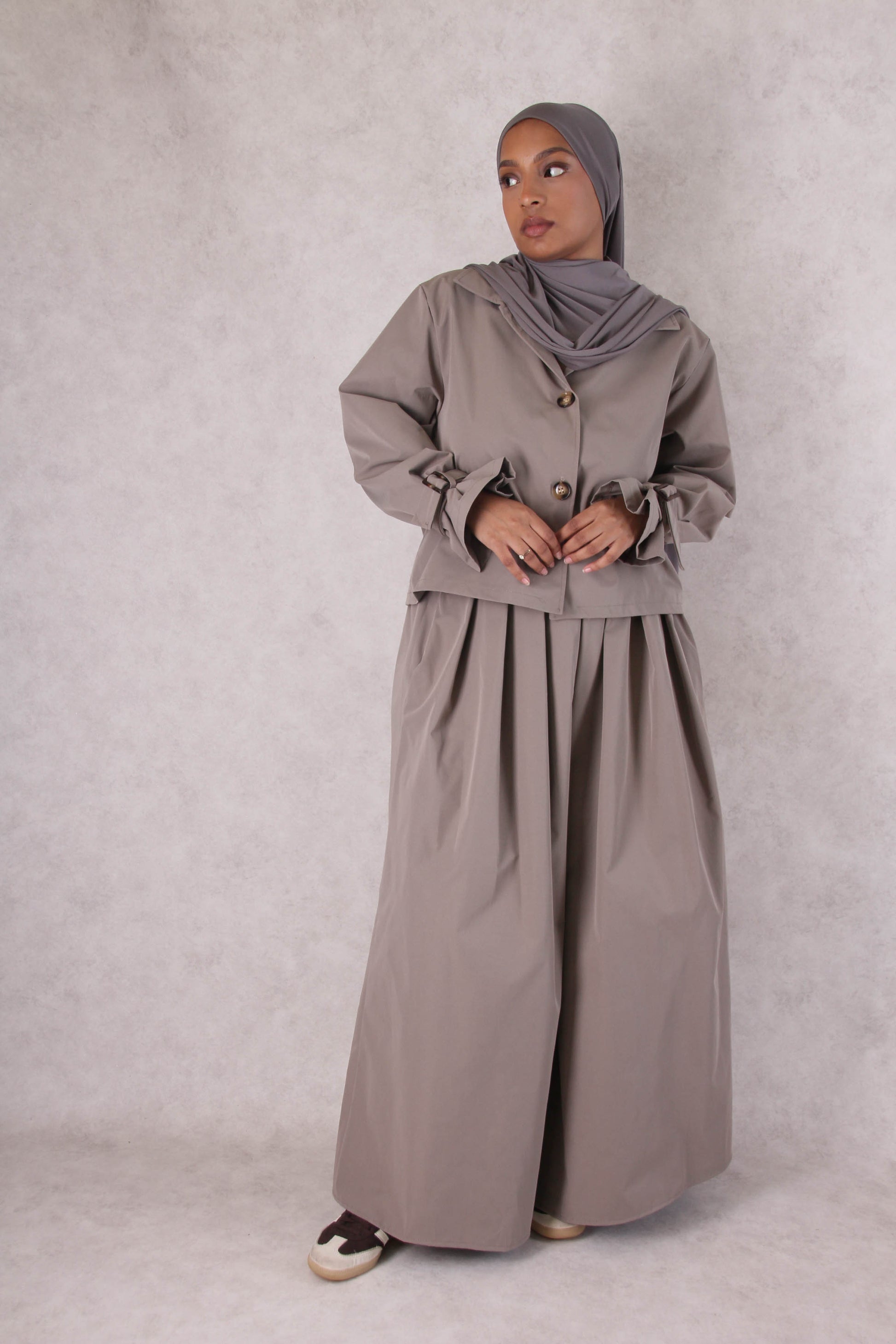 Un ensemble matière style imperméable et structuré qui allie confort et élégance. La veste oversize boutonnée apporte une touche moderne, tandis que la jupe longue plissée offre un tombé raffiné et modeste. Parfait pour une sortie habillée, ou au quotidien.