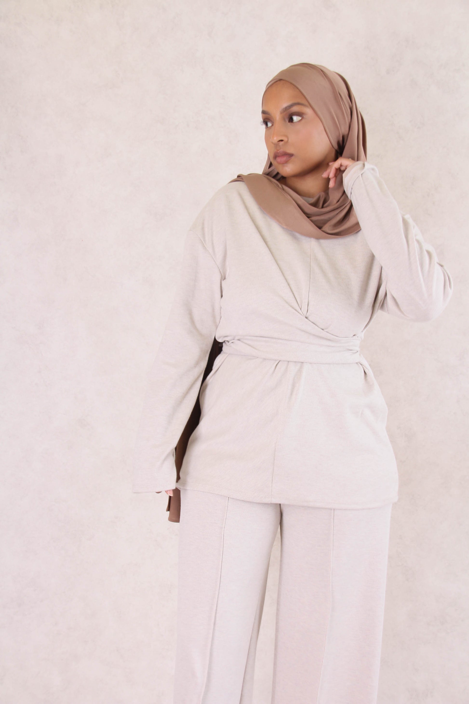 Un ensemble doux et confortable au look minimaliste et raffiné. Le haut croisé avec lien noué à la taille sublime la silhouette tout en gardant un tombé fluide, accompagné d’un pantalon large qui assure aisance et élégance.