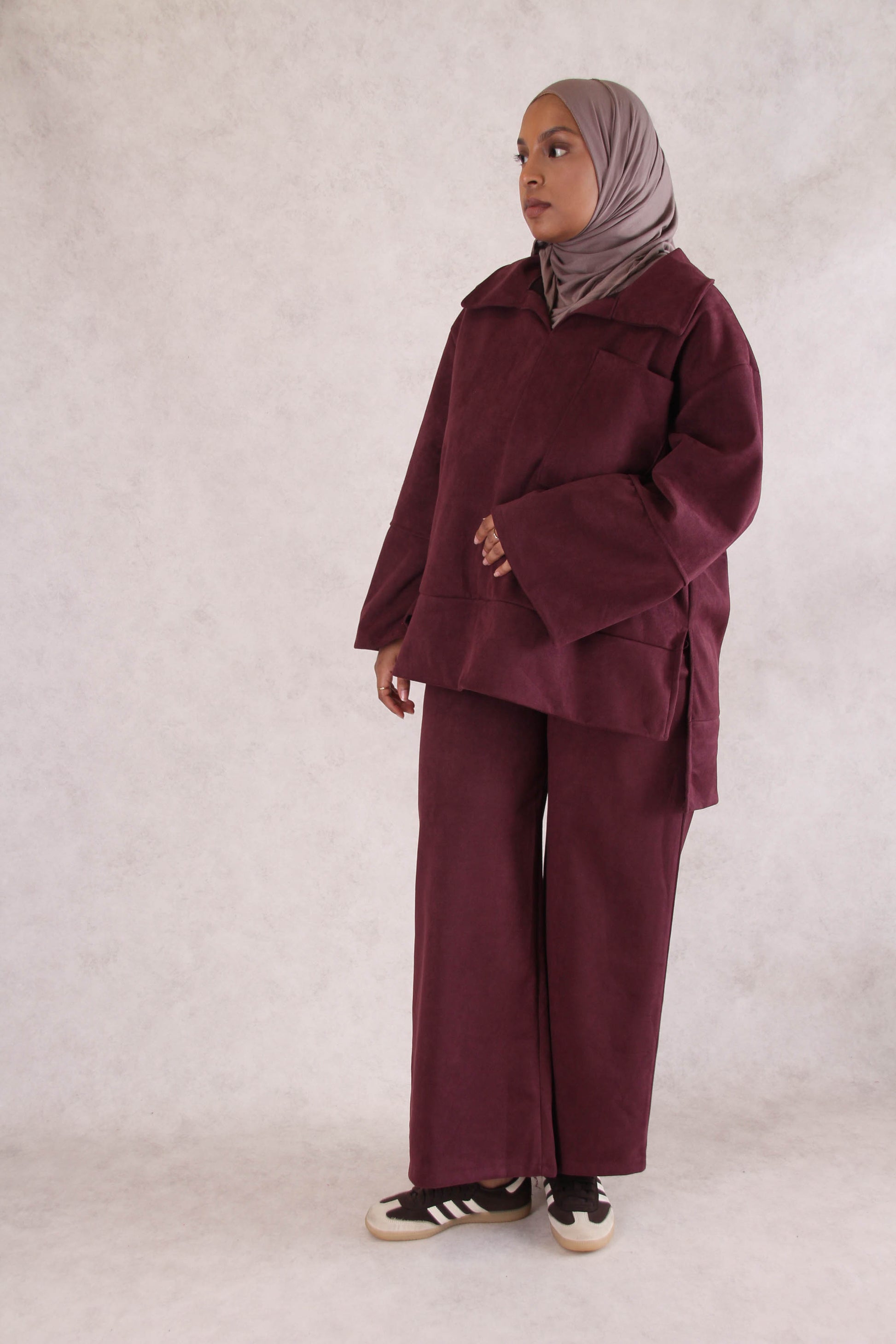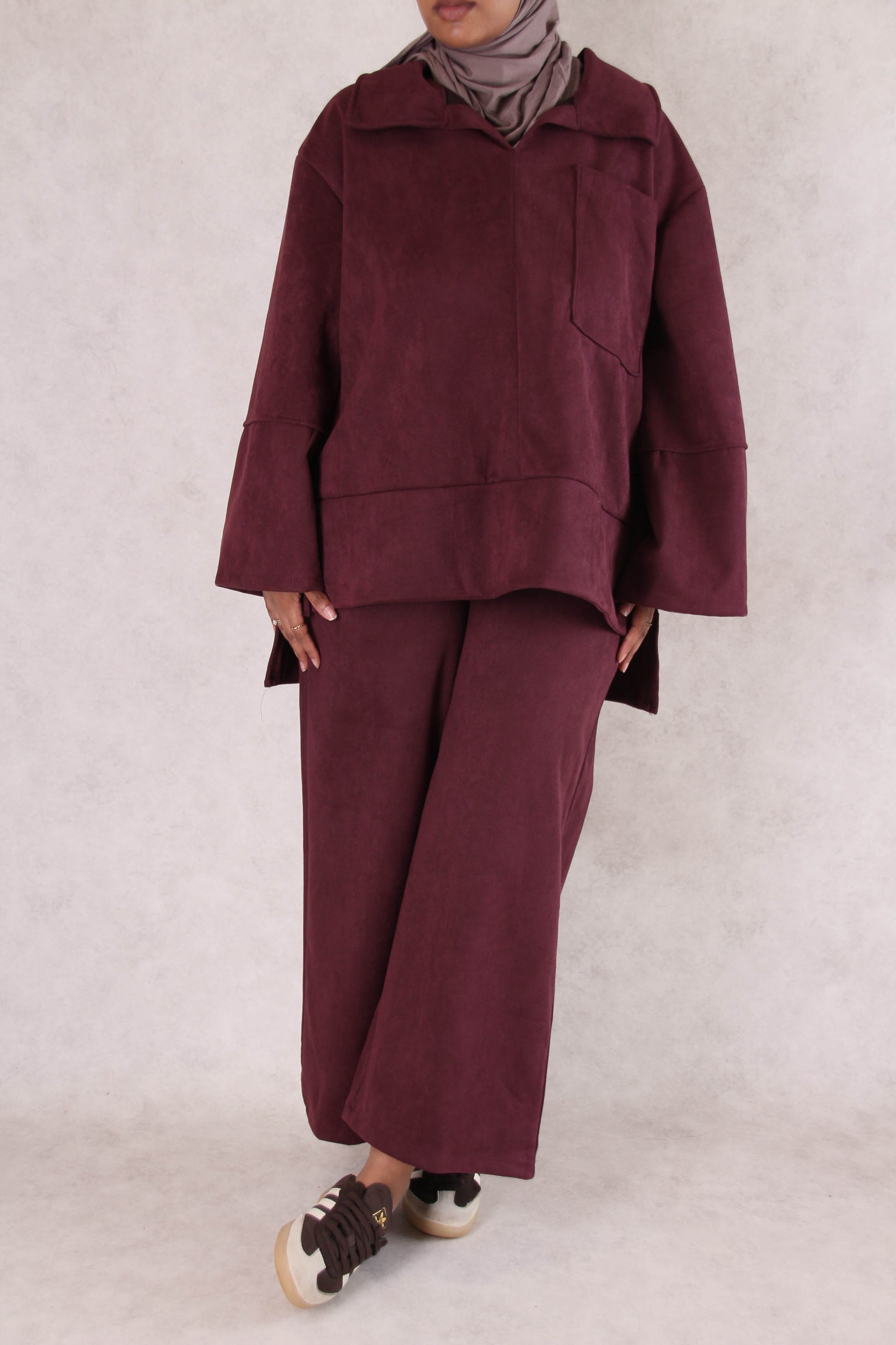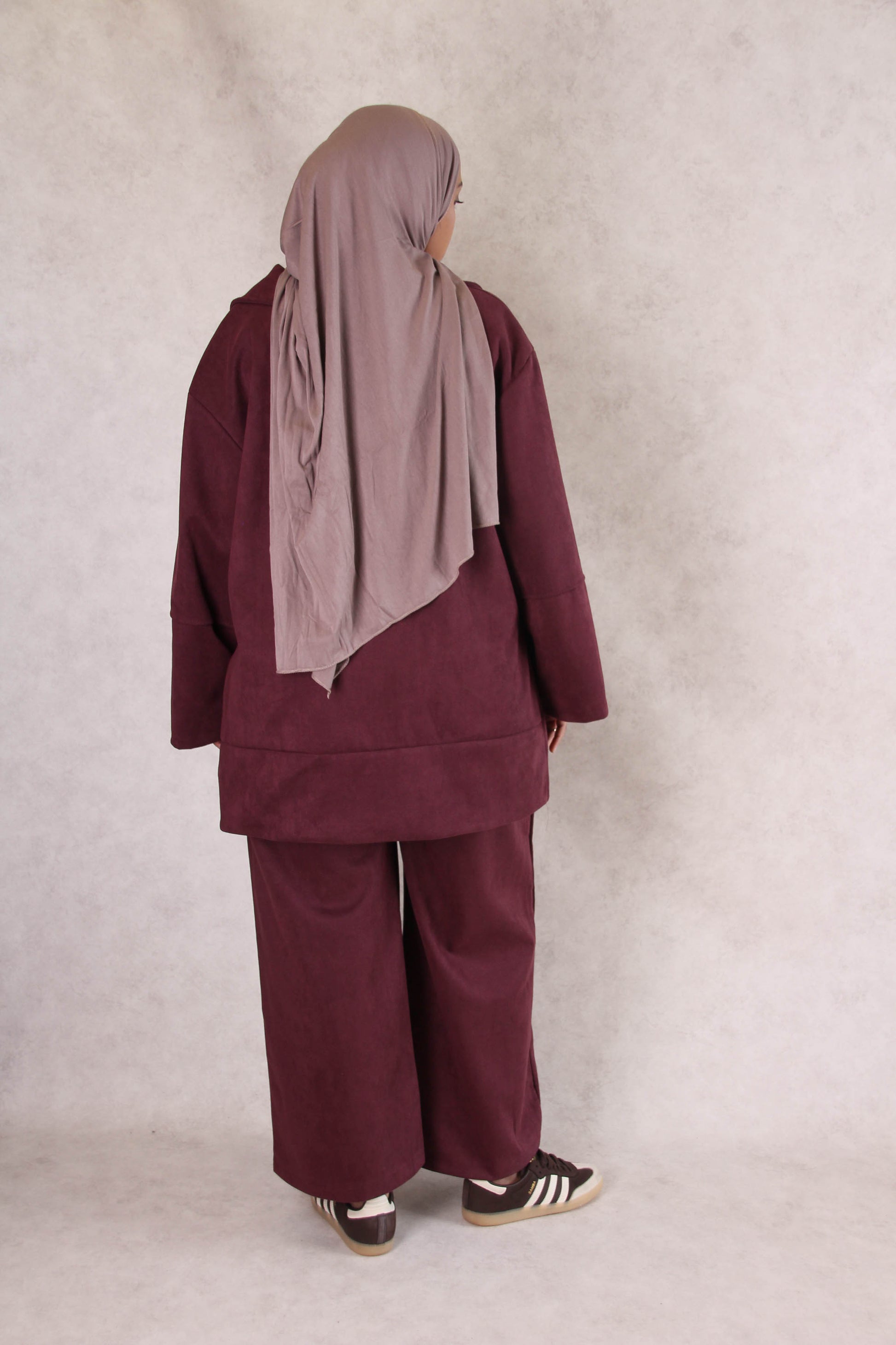 Un ensemble élégant et confortable au toucher daim qui allie style et praticité. Conçu pour offrir une allure chic au quotidien, il se compose d’une tunique longue et d’un pantalon fluide assorti.