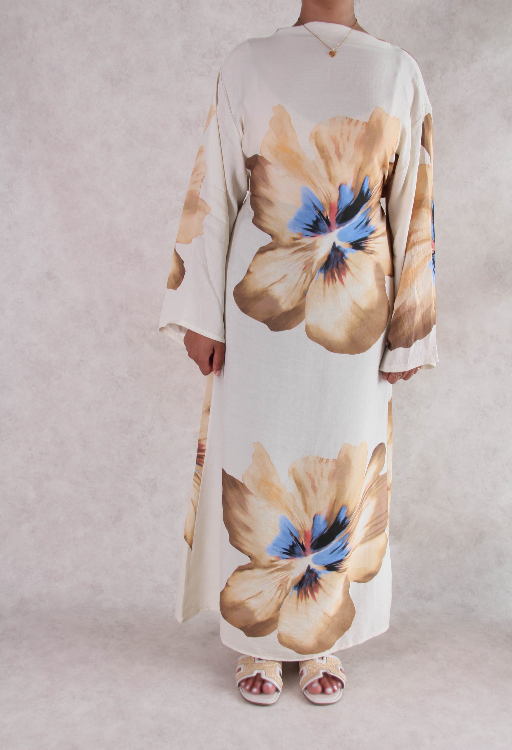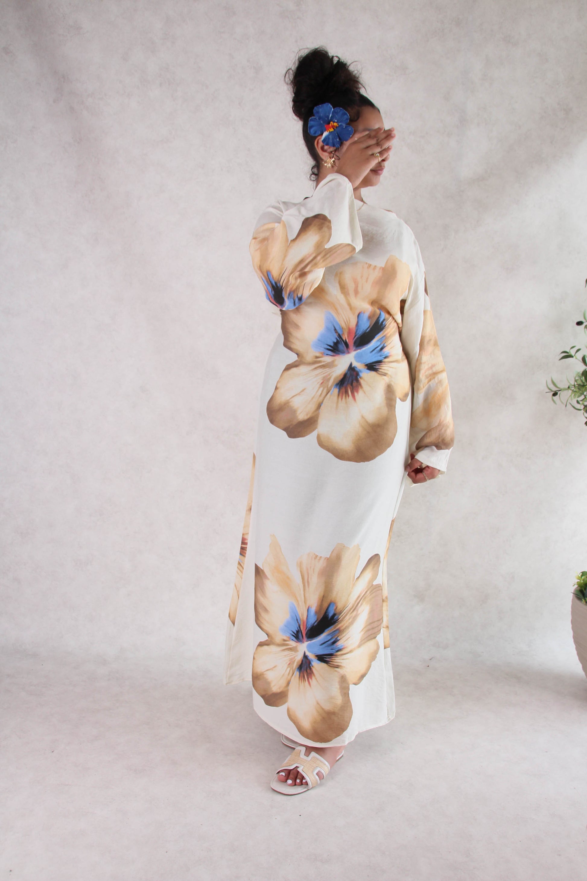 Faites entrer un souffle de fraîcheur dans votre garde-robe avec cette robe longue fluide à l’imprimé floral XXL. Sa coupe droite, sa matière au toucher lin, et son attache au dos en font une pièce à la fois chic et confortable.