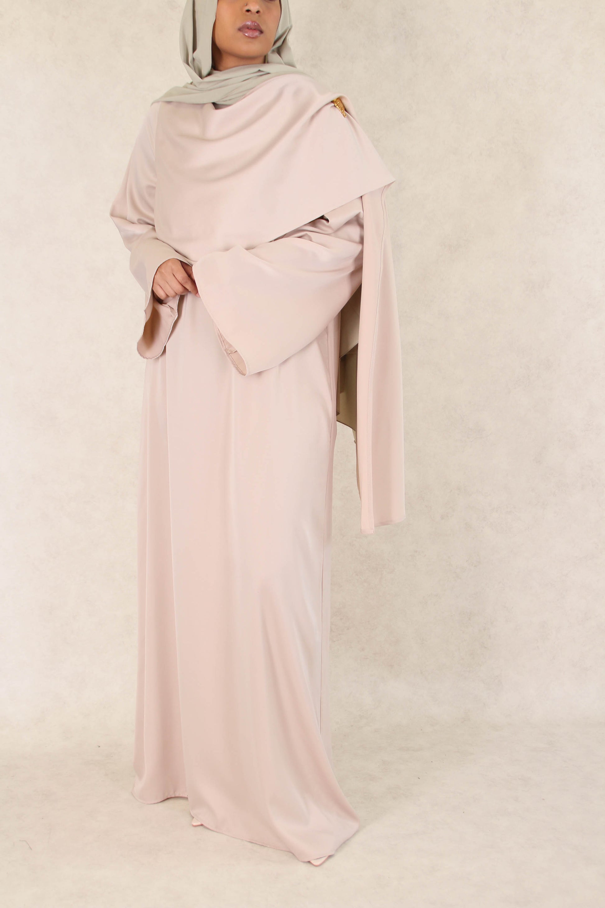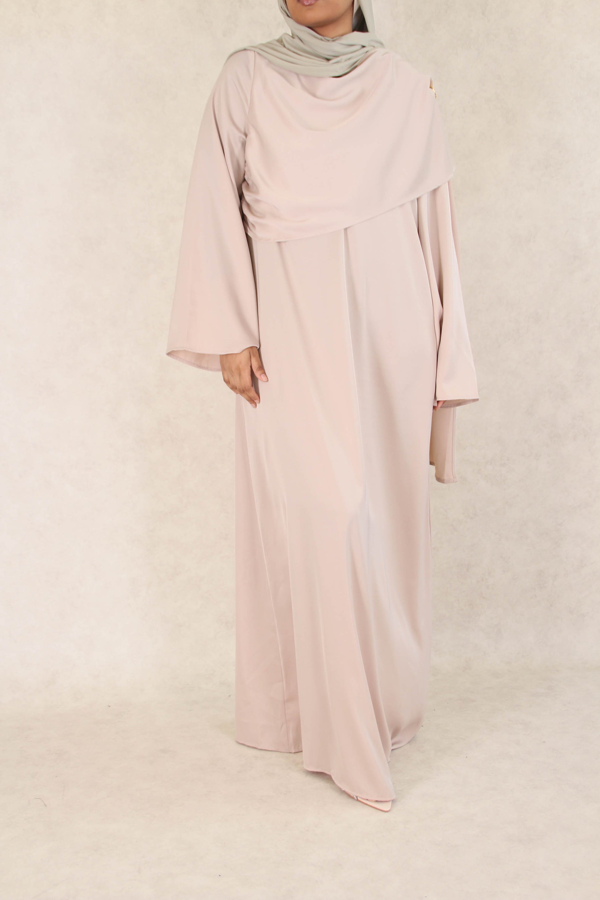 Optez pour l'élégance avec cette abaya drapée au style fluide et sophistiqué. Son effet cape asymétrique et ses manches évasées apportent une touche de modernité, tout en garantissant un tombé majestueux. Conçue dans un tissu doux et opaque, elle assure un confort absolu pour toutes les occasions : au quotidien, pour la prière ou lors de la fête de l'eid, mariage etc