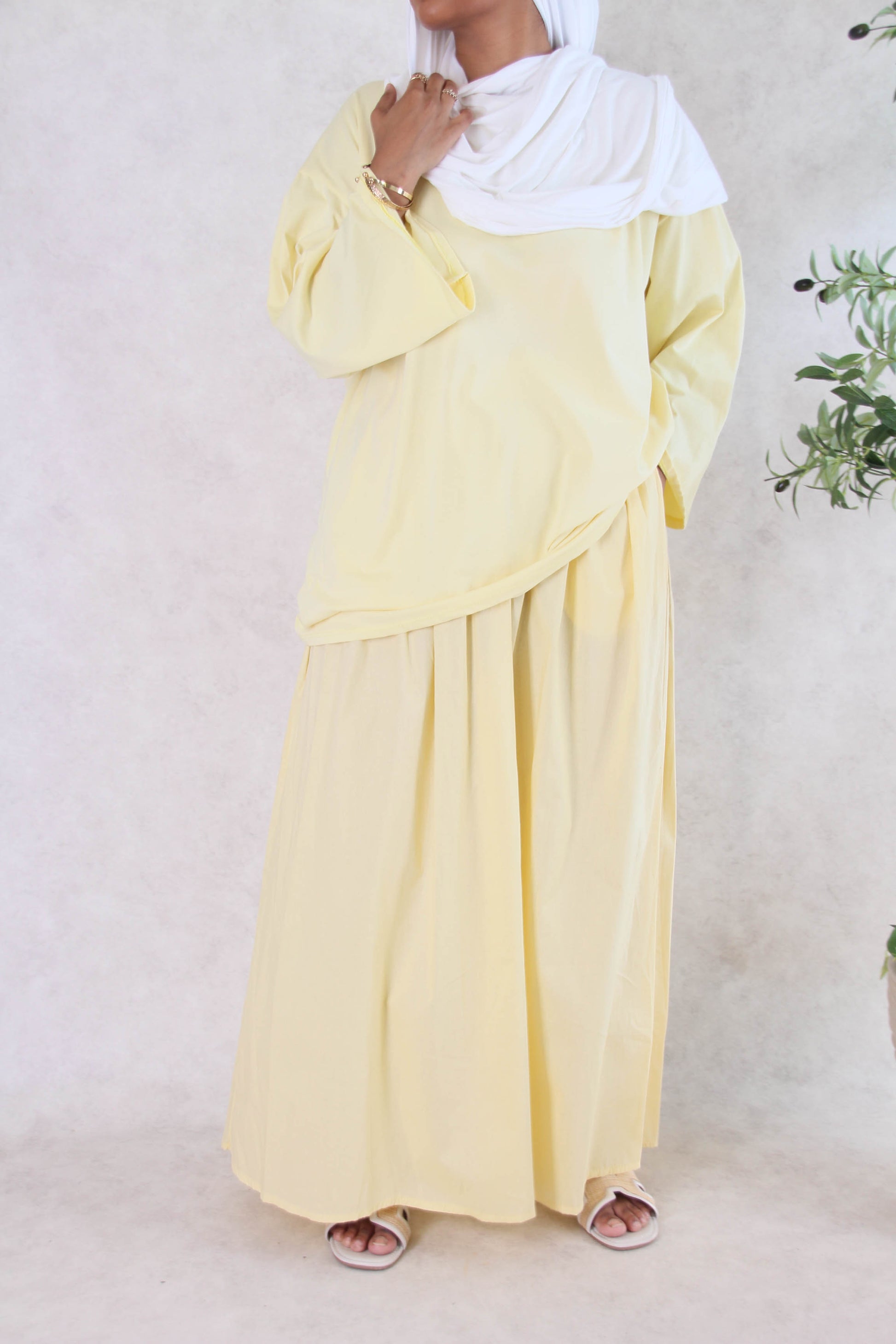 Le haut Layna est la pièce confortable et essentielle à avoir dans sa garde-robe. Confectionné dans un coton doux et respirant, il se distingue par sa coupe droite et longue (77 cm), parfaite pour un porté pudique avec jupe ou pantalon.