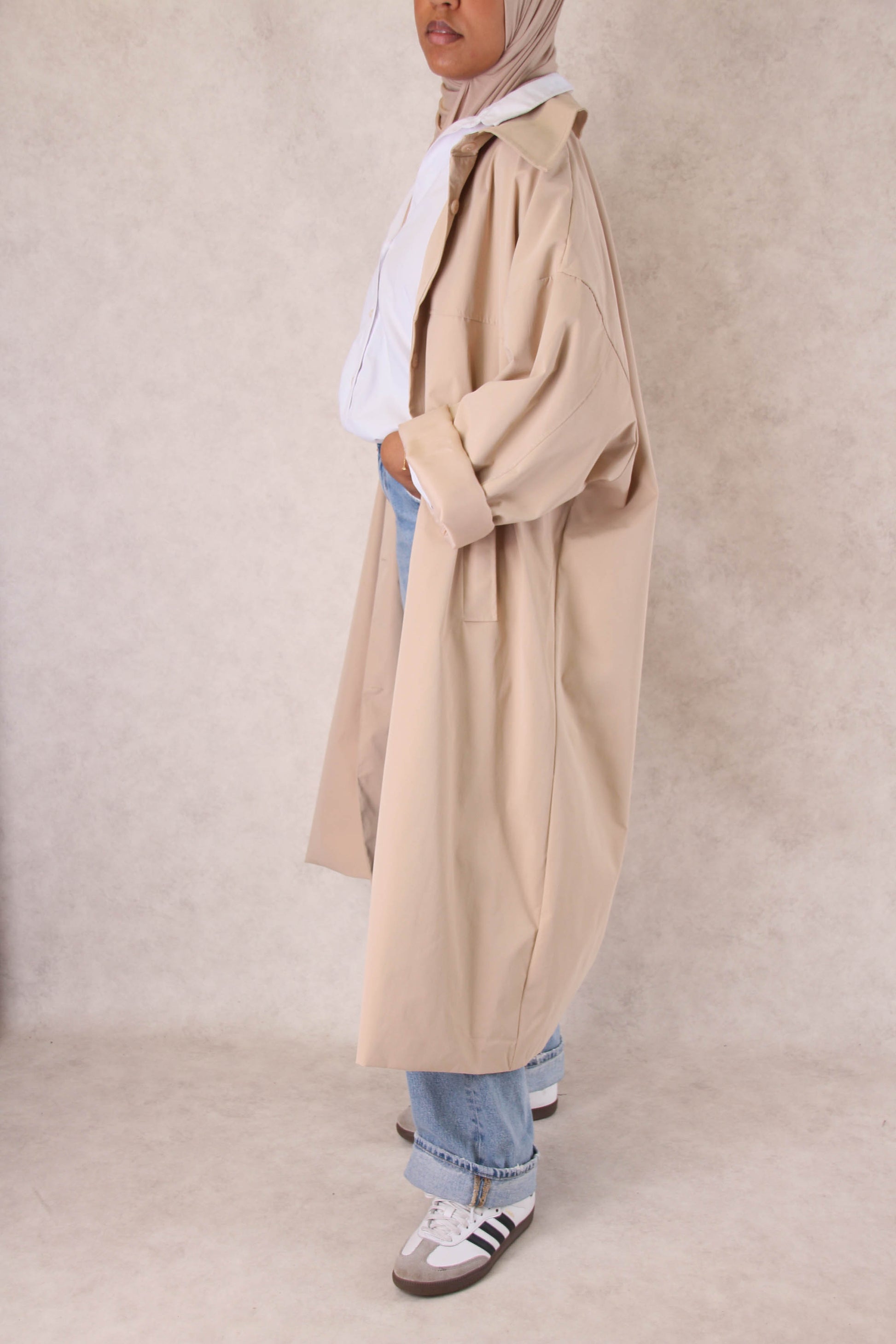 Un trench long à la coupe loose, fluide et moderne. Son tombé droit et ample apporte confort et élégance, parfait pour un look modeste chic. Minimaliste et intemporel, il s’adapte facilement à toutes les silhouettes et se porte aussi bien au quotidien que pour une occasion habillée.